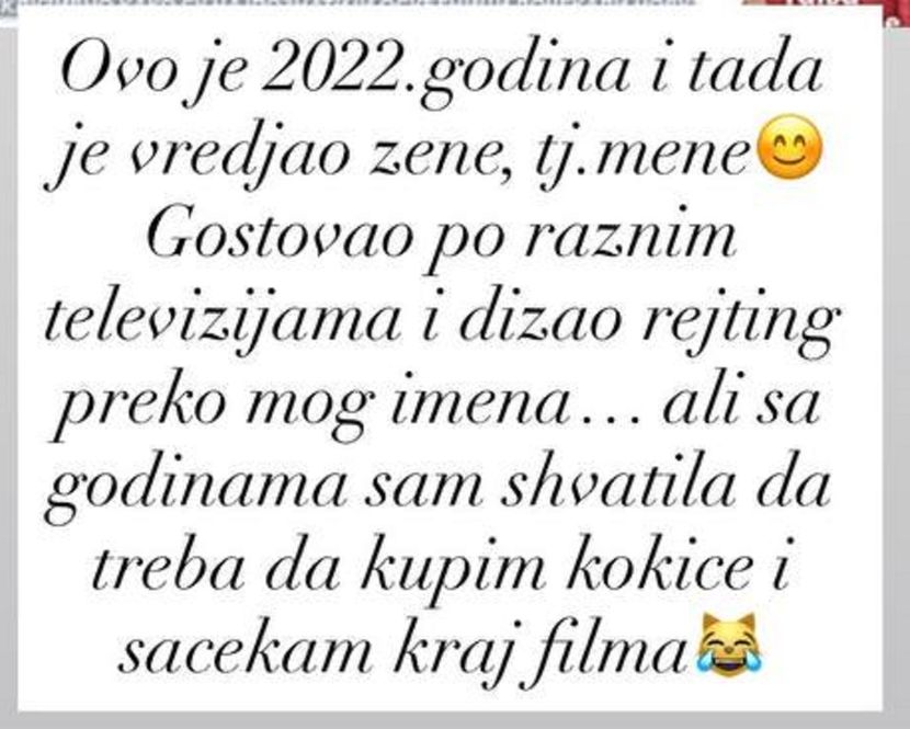 "Ovo je 2022. godina i tada je vrijeđao žene, tj. mene. Gostovao po raznim televizijama i dizao rejting preko mog imena... Ali sa godinama sam shvatila da treba da kupim kokice i sačekam kraj filma ", napisala je Sneža Borjan na društvenoj mreži Instagram uz emotikon koji se smije, da bi potom dodala: