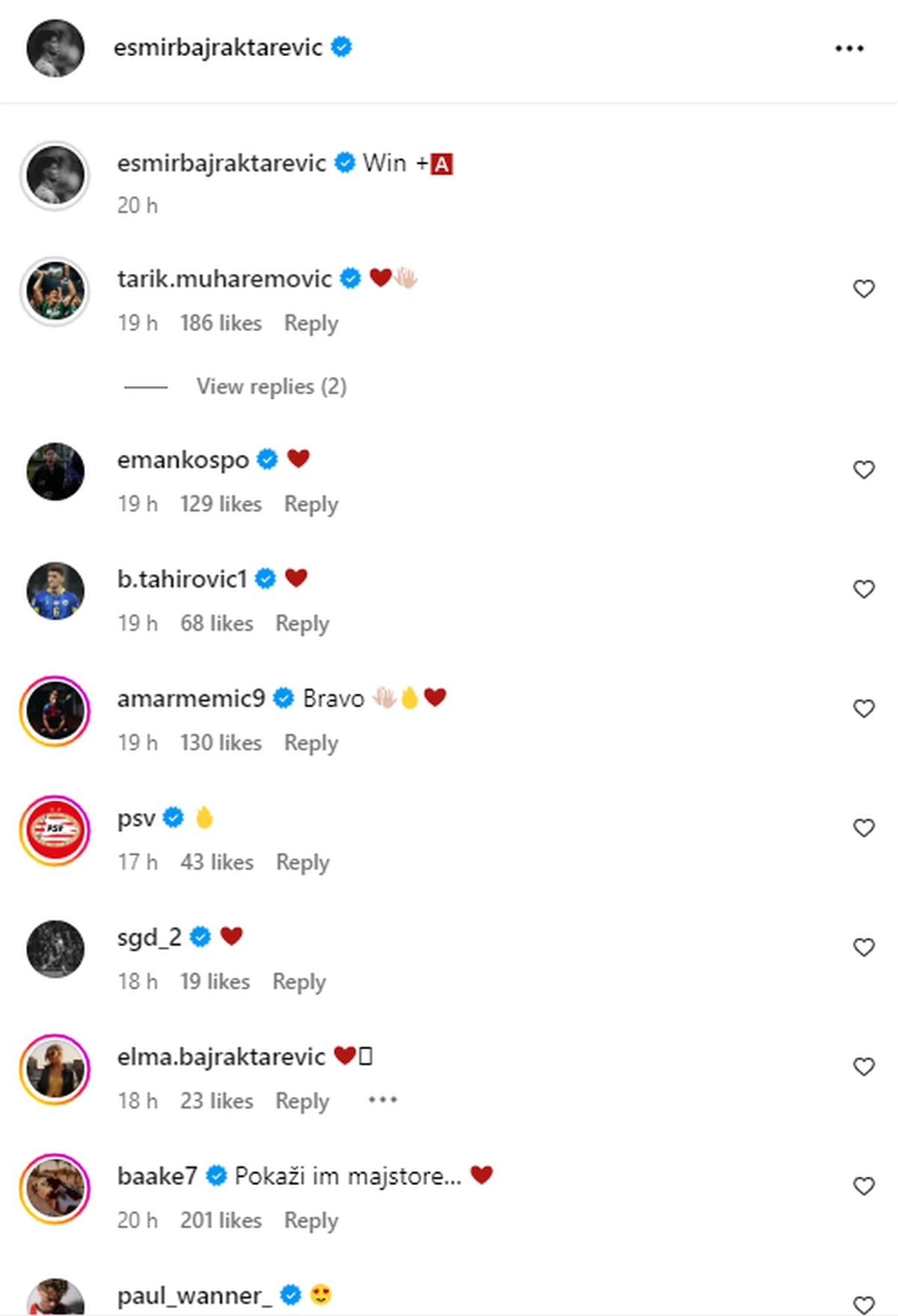 Esmir Bajraktarević odigrao je svih 90 minuta u pobjedi PSV-a protiv Volendama (3:0) i oglasio se na društvenim mrežama nakon susreta, a potom su mu objavu "okupirali" sadašnji i bivši reprezentativci Bosne i Hercegovine.