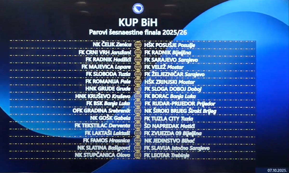 Odlukom žrijeba u šesnaestini finala Kupa BiH gledat ćemo duele: