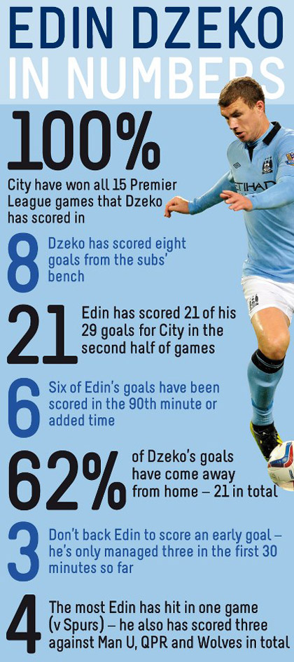 Edin je postizao golove protiv Southamptona, QPR-a, Real Madrida i Fulhama. Jedan je od miljenika navijača Cityja, koji često spominju njegovo ime u svojim pjesmama na tribinama.