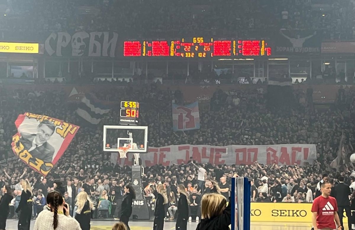 Na susretu gdje se očekivalo sve osim mirne atmosfere, navijači Crvene zvezde izvukli su transparent s namjerom da bocnu svoje najveće rivale. Velikim slovima stajalo je: